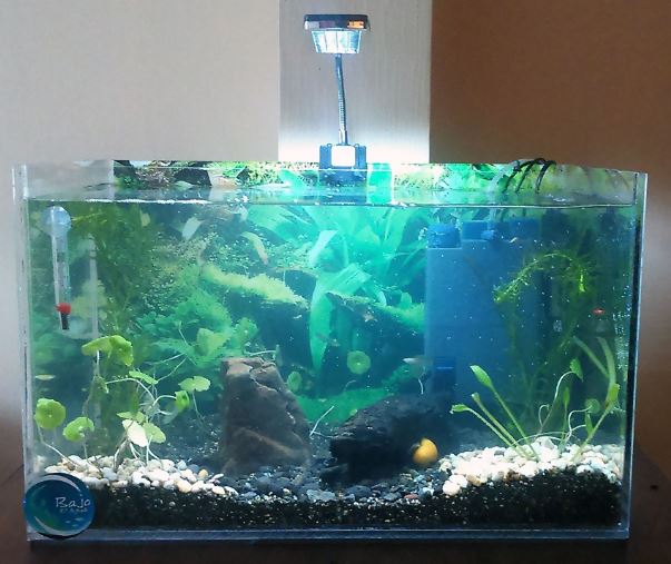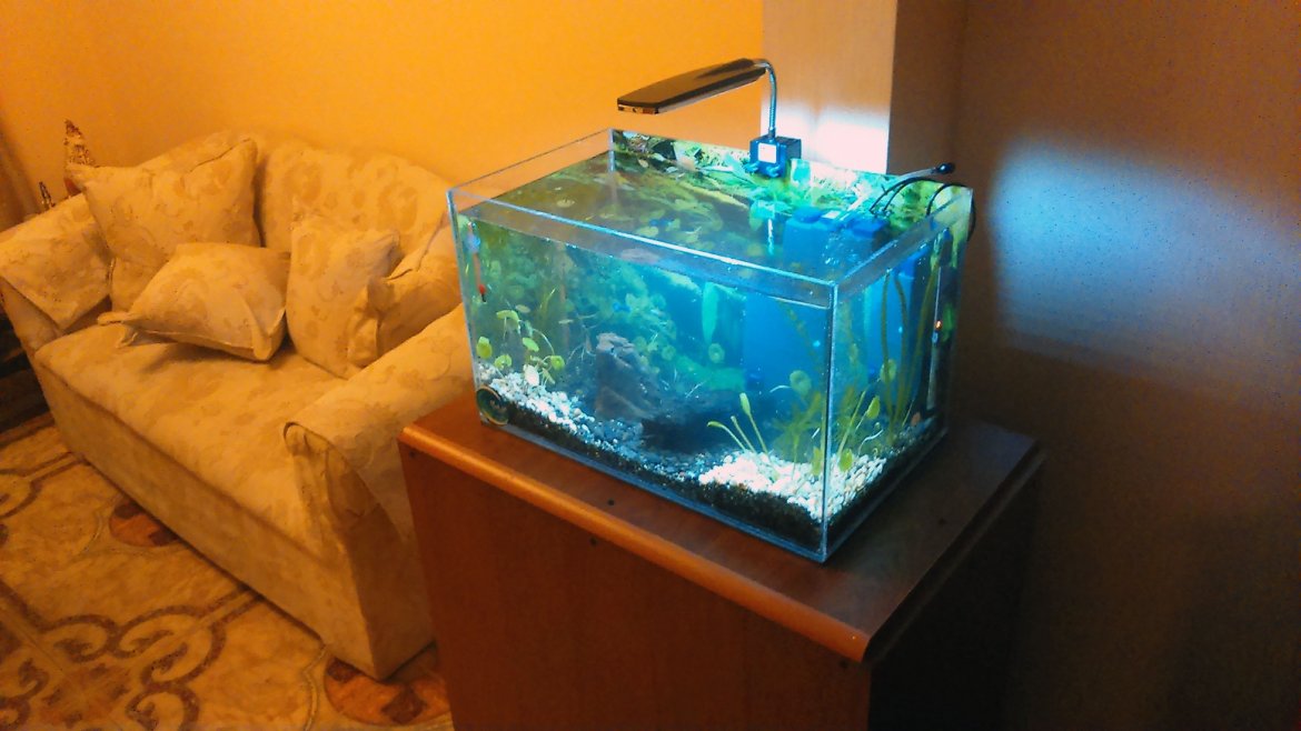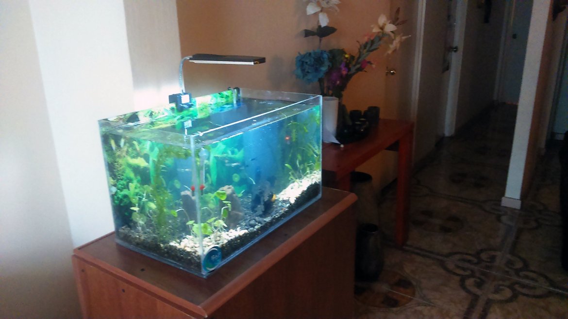 Acuario de peces de agua cálida con plantas naturales, instalado en sala de estar.